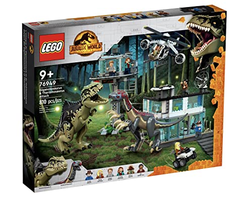 LEGO Jurassic World Giganotosaurus & Therizinosaurus Attack features 2 posable dinosaur toy figures for youngsters, a buildable HQ, a toy garage for the ATV car toy, an commentary tower and a helicopter