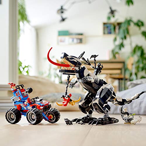 The creative play intensifies when kids place the Venom minifigure into the Venomosaurus, with its vicious jaws and black internet-weapons, and put Spider-Man into his vehicle with its awesome weapons and super-suspension